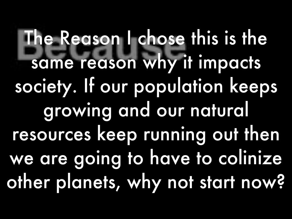 The Reason I chose this is the same reason why it impacts society. If our population keeps growing and our natural resources keep running out then we are going to have to colinize other planets, why not start now?