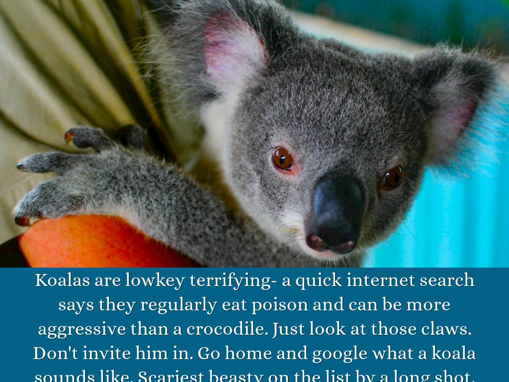 Koalas are lowkey terrifying- a quick internet search says they regularly eat poison and can be more aggressive than a crocodile. Just look at those claws. Don't invite him in. Scariest beasty on the list by a long shot.