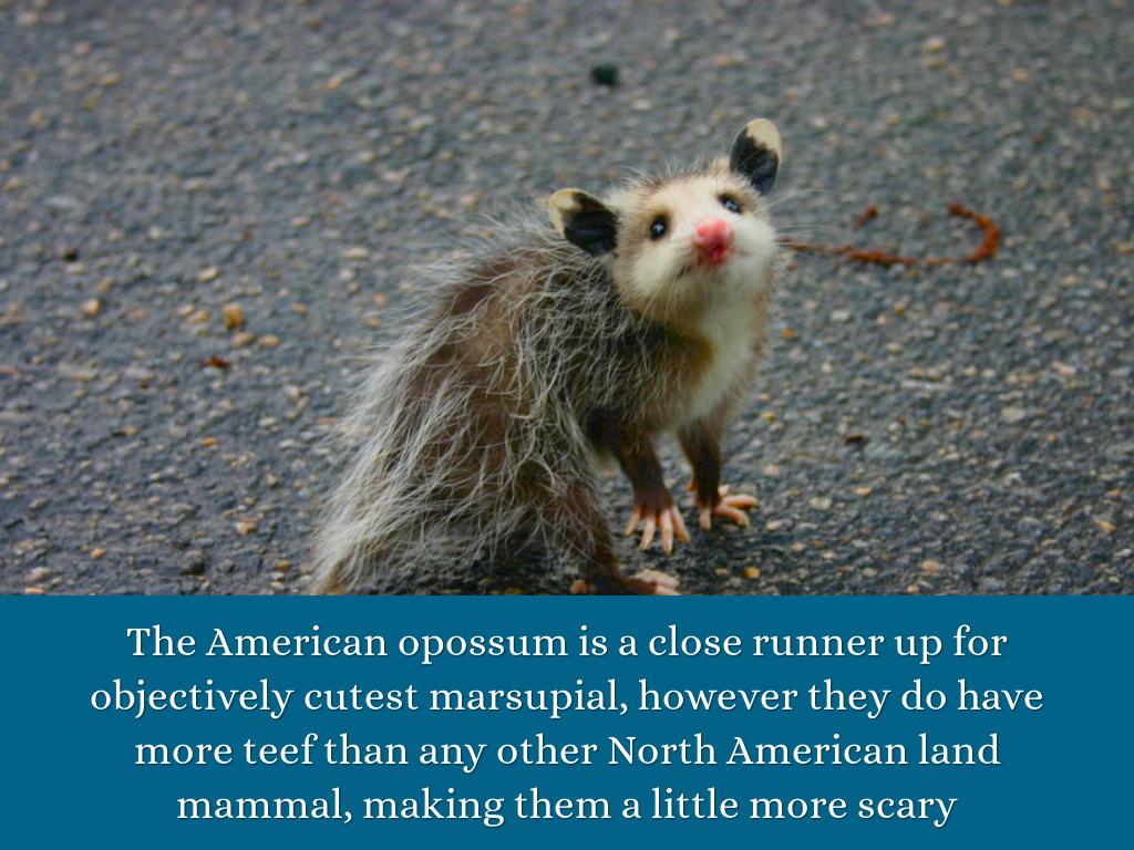 The American opossum is a close runner up for objectively cutest marsupial, however they do have more teef than any other North American land mammal, making them a little more scary