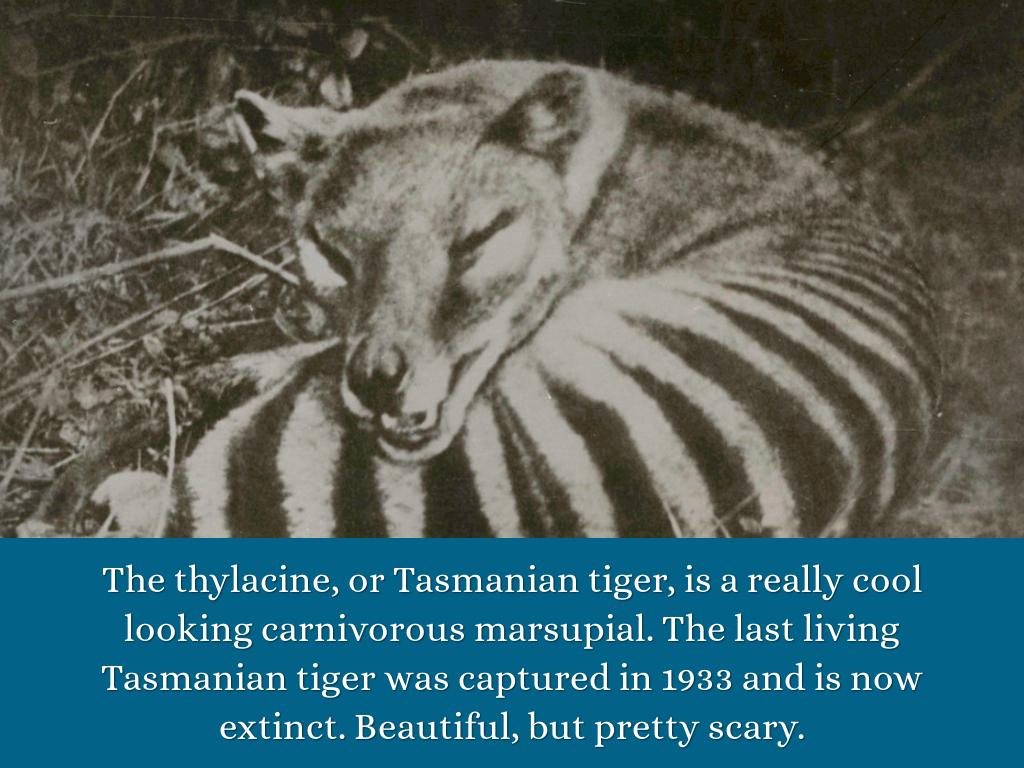 The thylacine, or Tasmanian tiger, is a really cool looking carnivorous marsupial. The last living Tasmanian tiger was captured in 1933 and the species is now extinct. Beautiful, but pretty scary.