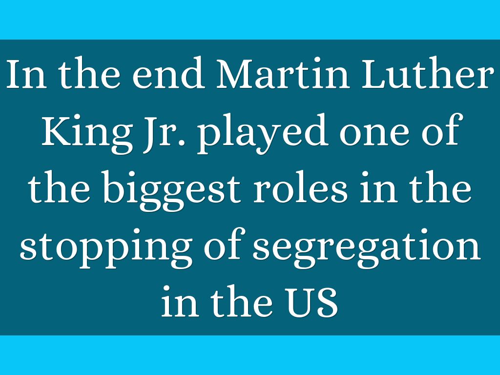 In the end Martin Luther King Jr. played one of the biggest roles in the stopping of segregation in the US
