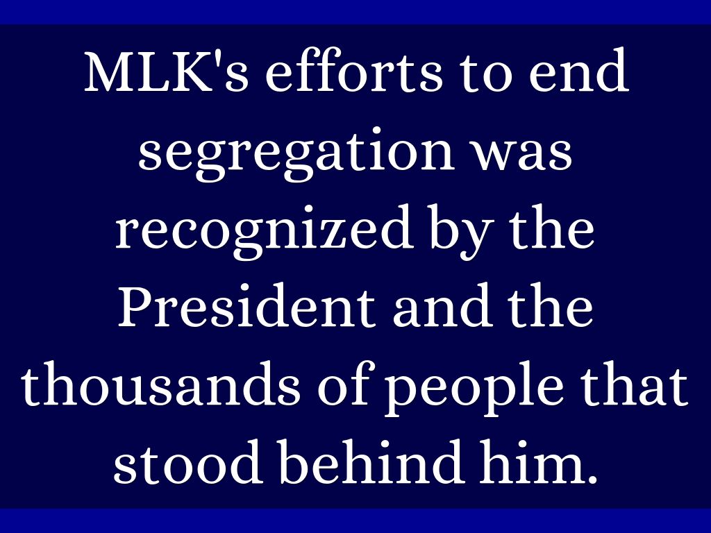MLK's efforts to end segregation was recognized by the President and the thousands of people that stood behind him.