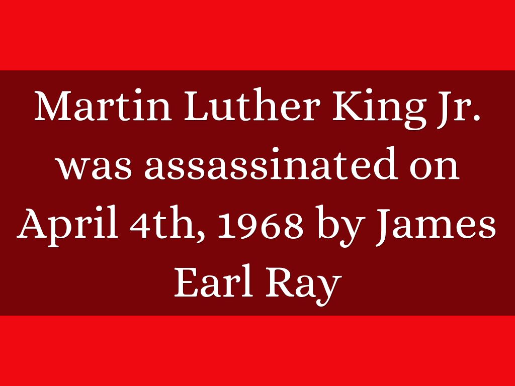 Martin Luther King Jr. was assassinated on April 4th, 1968 by James Earl Ray