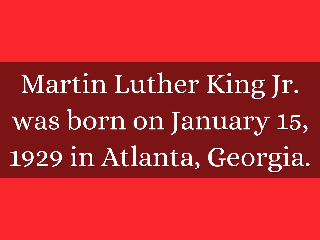 Martin Luther King Jr. was born on January 15, 1929 in Atlanta, Georgia.