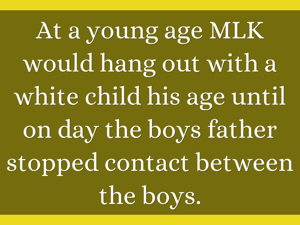 At a young age MLK would hang out with a white child his age until on day the boys father stopped contact between the boys.