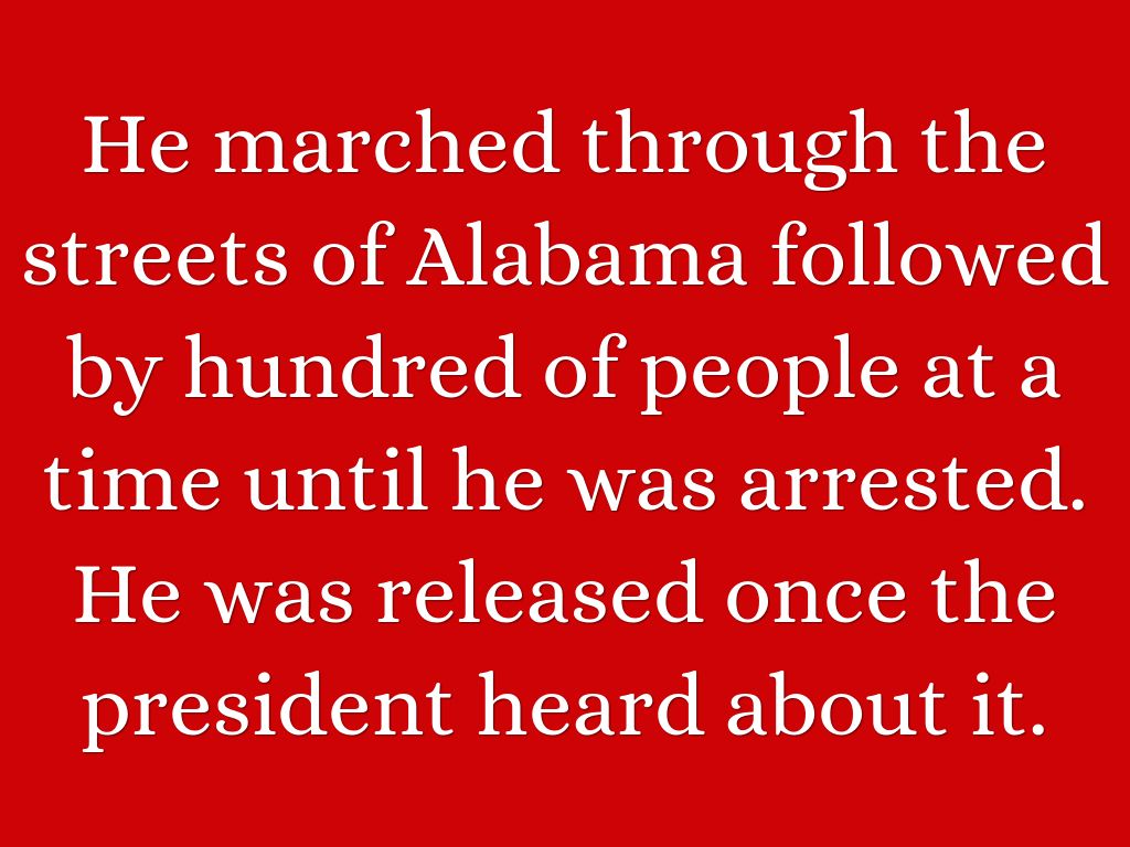 He marched through the streets of Alabama followed by hundred of people at a time until he was arrested. He was released once the president heard about it.