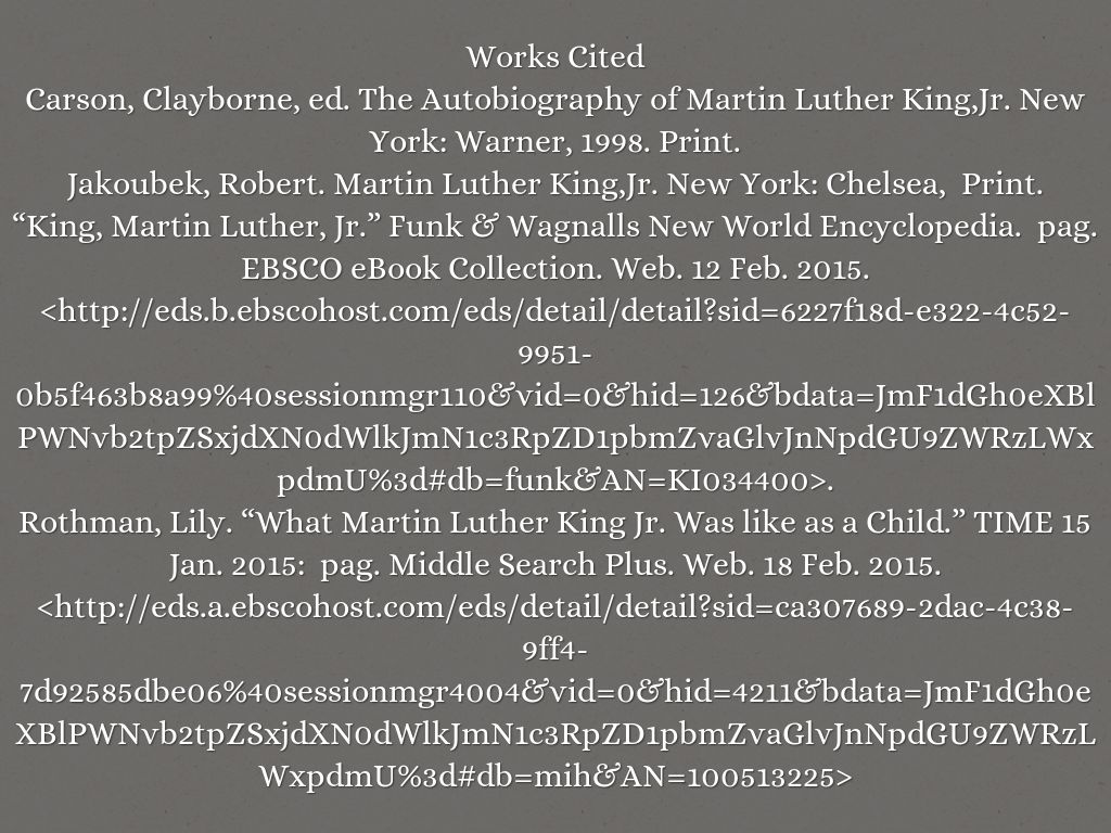 “King, Martin Luther, Jr.” Funk & Wagnalls New World Encyclopedia. pag. EBSCO eBook Collection. Web. 12 Feb. 2015. .