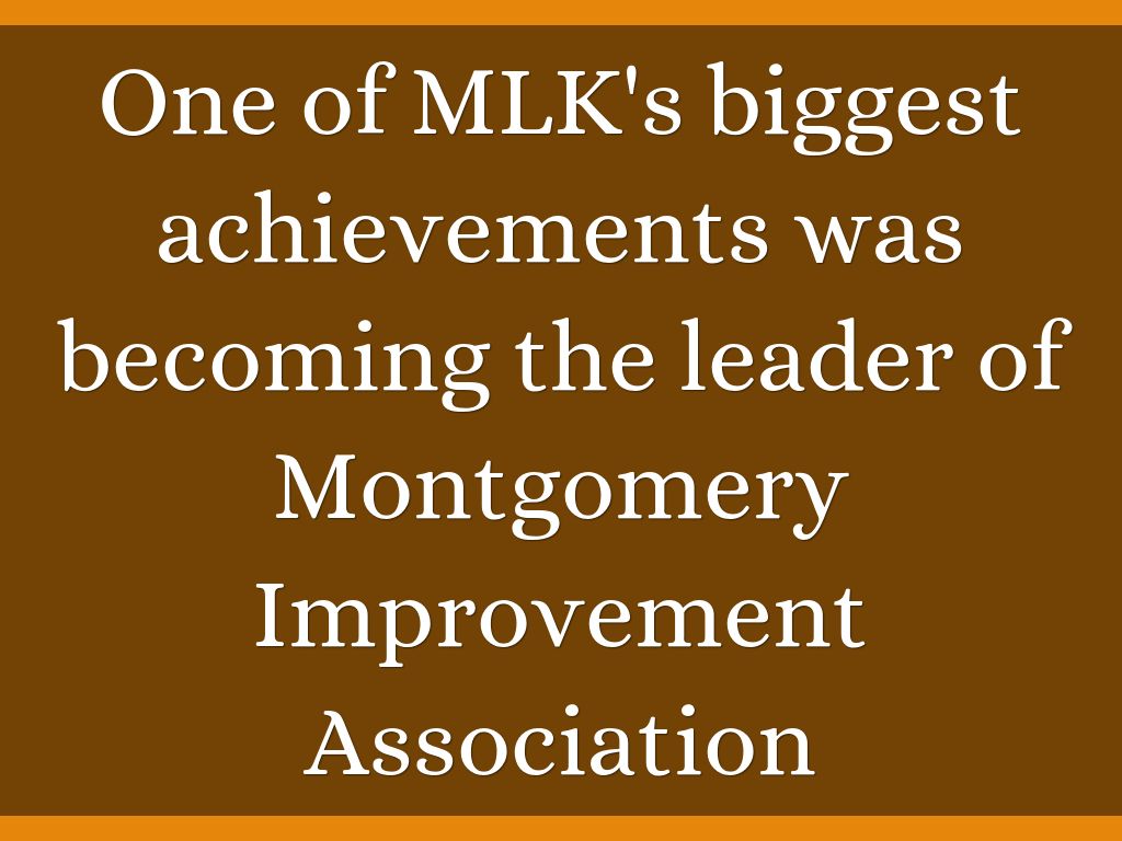 One of MLK's biggest achievements was becoming the leader of Montgomery Improvement Association