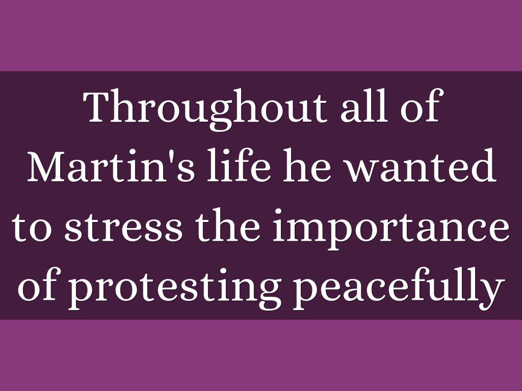 Throughout all of Martin's life he wanted to stress the importance of protesting peacefully