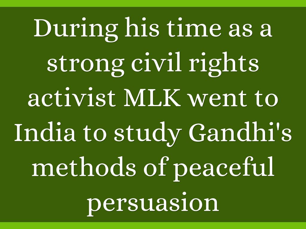 During his time as a strong civil rights activist MLK went to India to study Gandhi's methods of peaceful persuasion