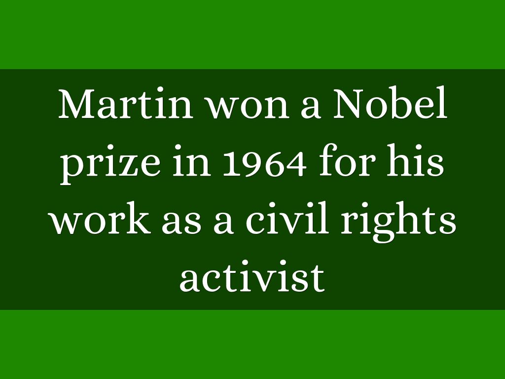 Martin won a Nobel prize in 1964 for his work as a civil rights activist