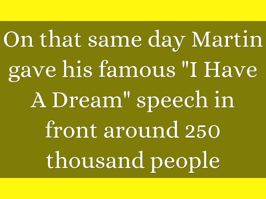 On that same day Martin gave his famous "I Have A Dream" speech in front around 250 thousand people