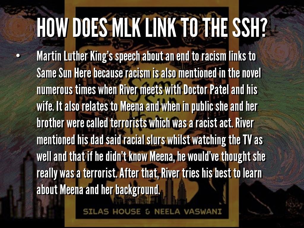 Martin Luther King's speech about an end to racism links to Same Sun Here because racism is also mentioned and referenced in the novel numerous times. Some examples include: