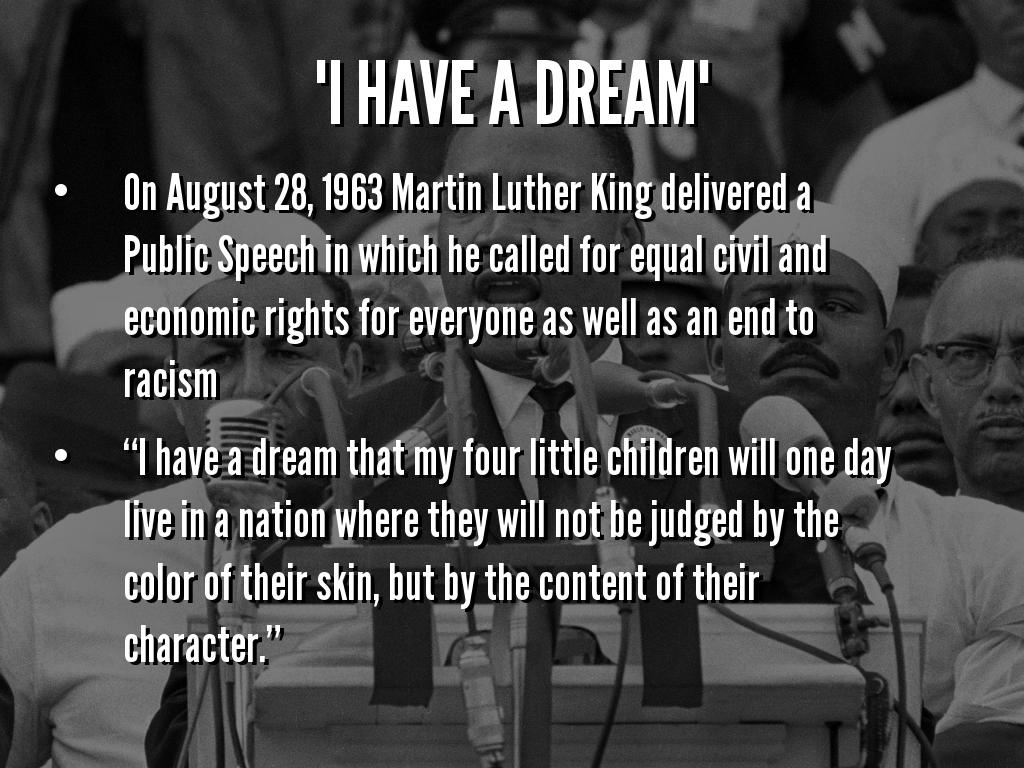 On August 28, 1963 Martin Luther King delivered a Public Speech in which he called for equal civil and economic rights for everyone as well as an end to racism