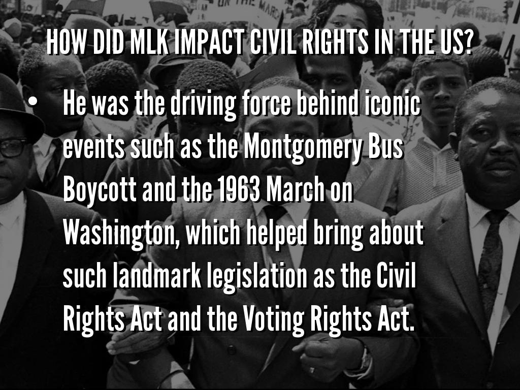 He was the driving force behind iconic events such as the Montgomery Bus Boycott and the 1963 March on Washington, which helped bring about such landmark legislation as the Civil Rights Act and the Voting Rights Act.