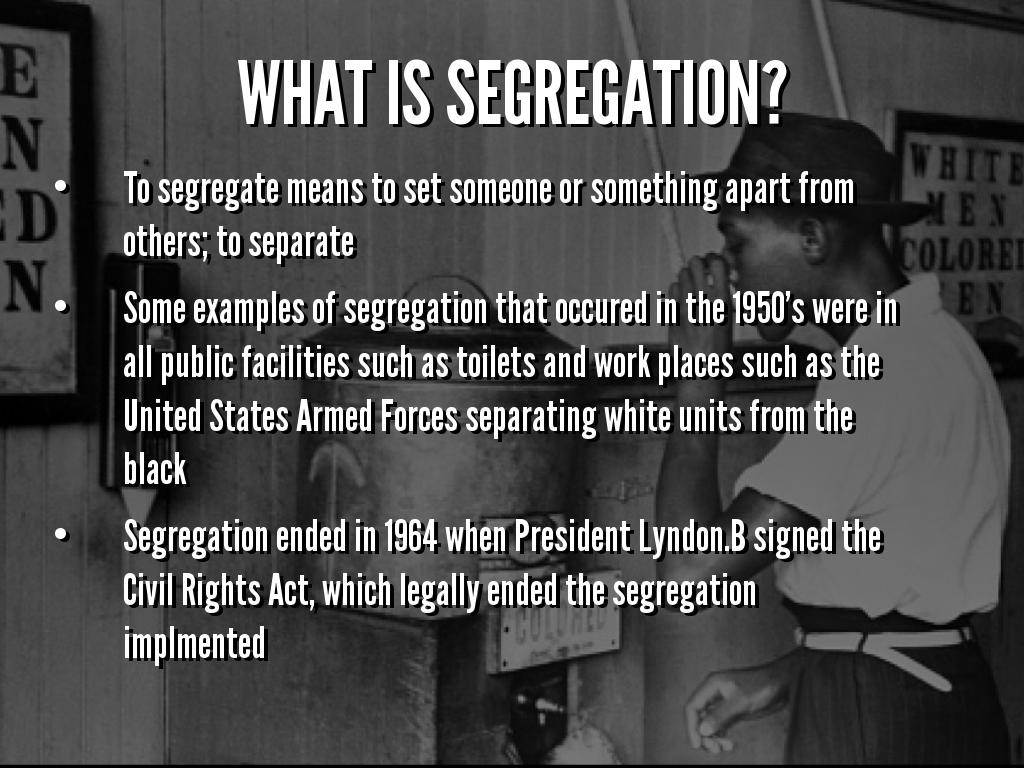 Some examples of segregation that occured in the 1950's were in all public facilities such as toilets and work places such as the United States Armed Forces separating white units from the black