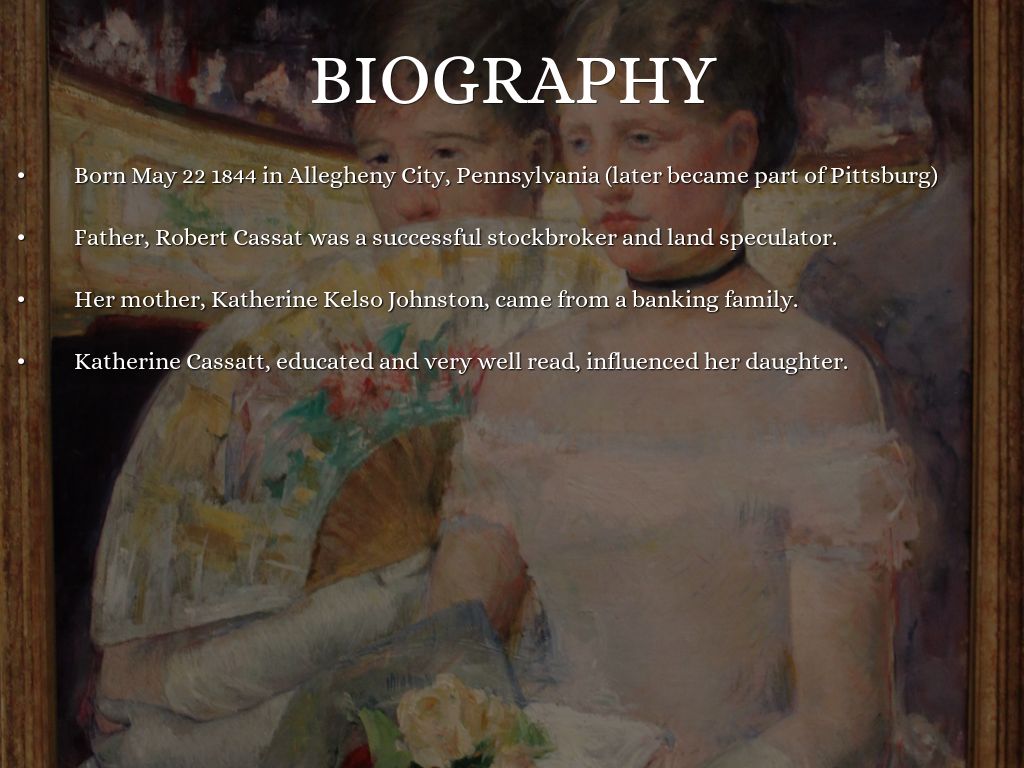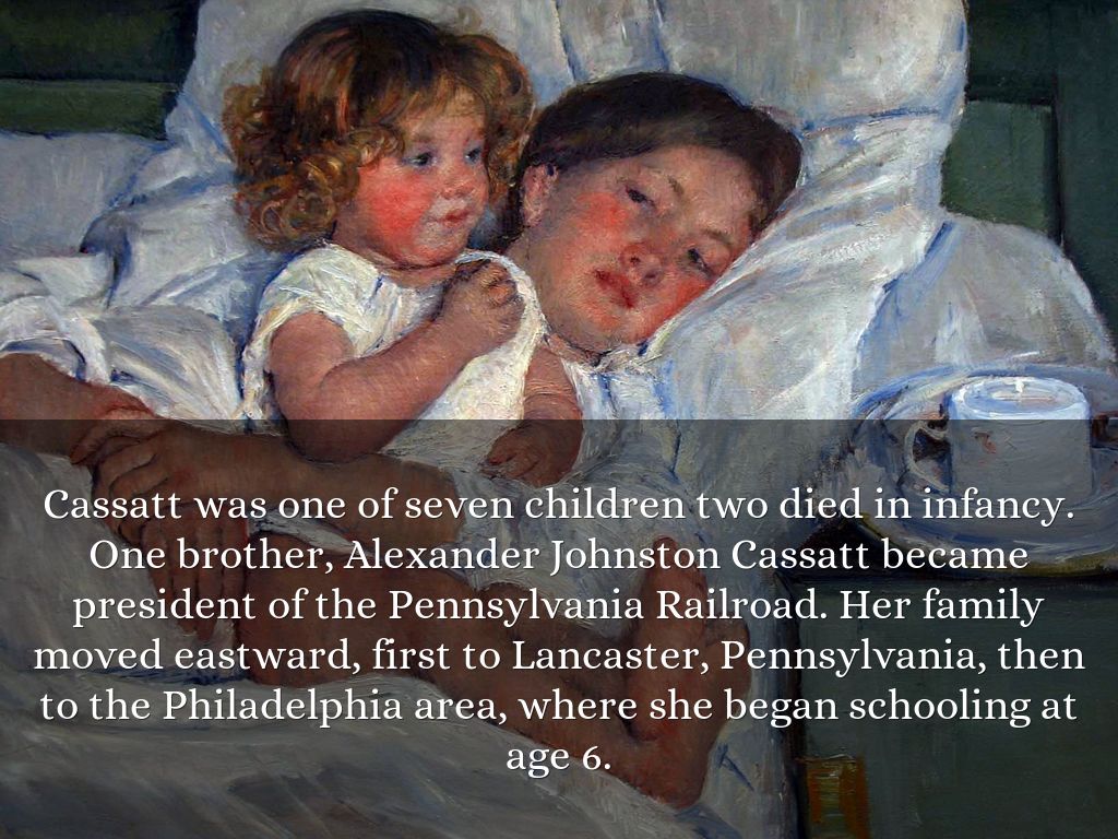 Cassatt was one of seven children two died in infancy. One brother, Alexander Johnston Cassatt became president of the Pennsylvania Railroad. Her family moved eastward, first to Lancaster, Pennsylvania, then to the Philadelphia area, where she began schooling at age 6.