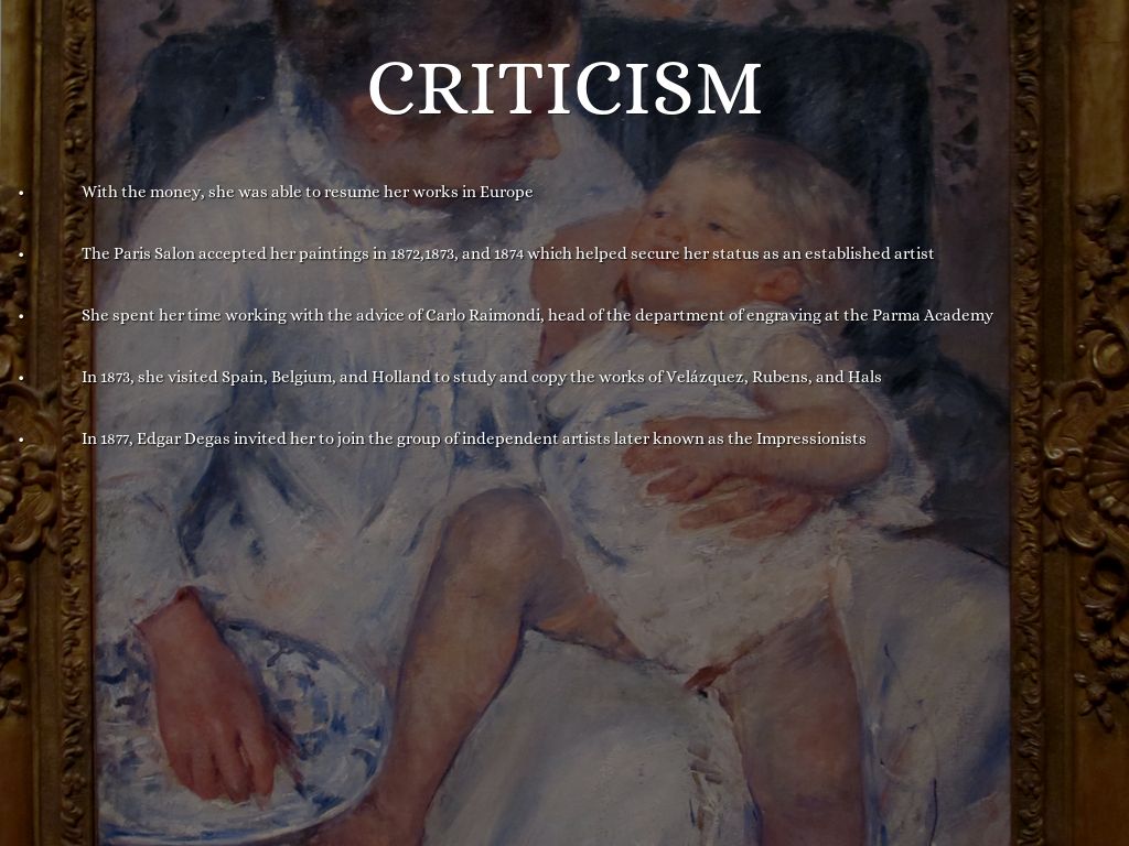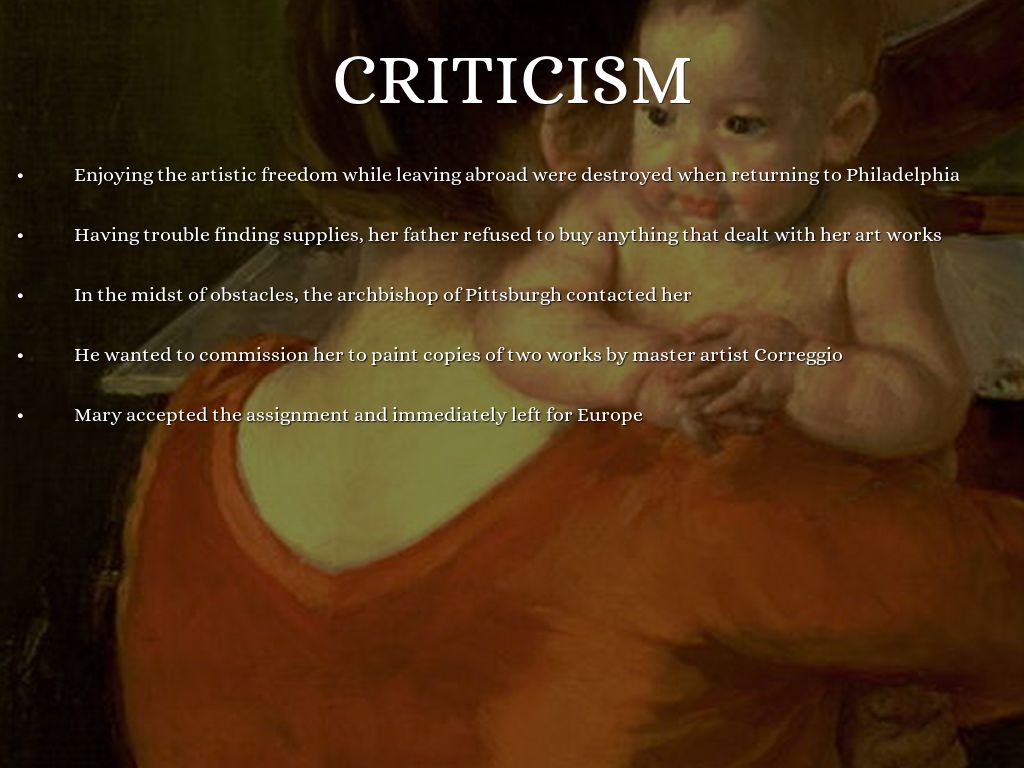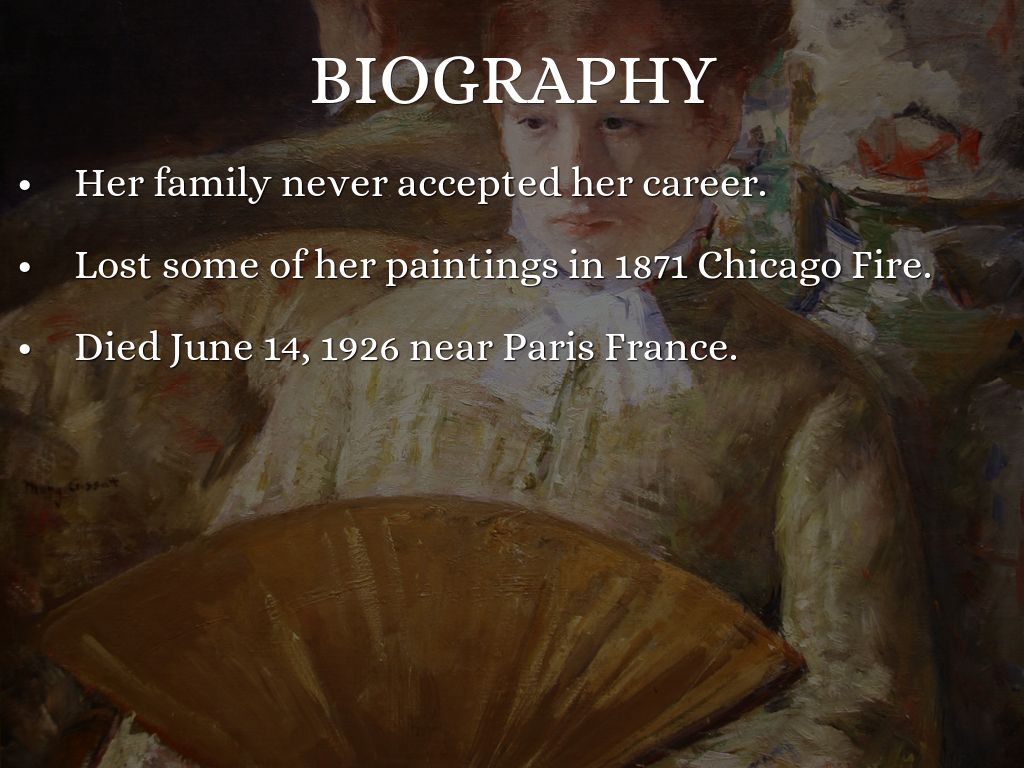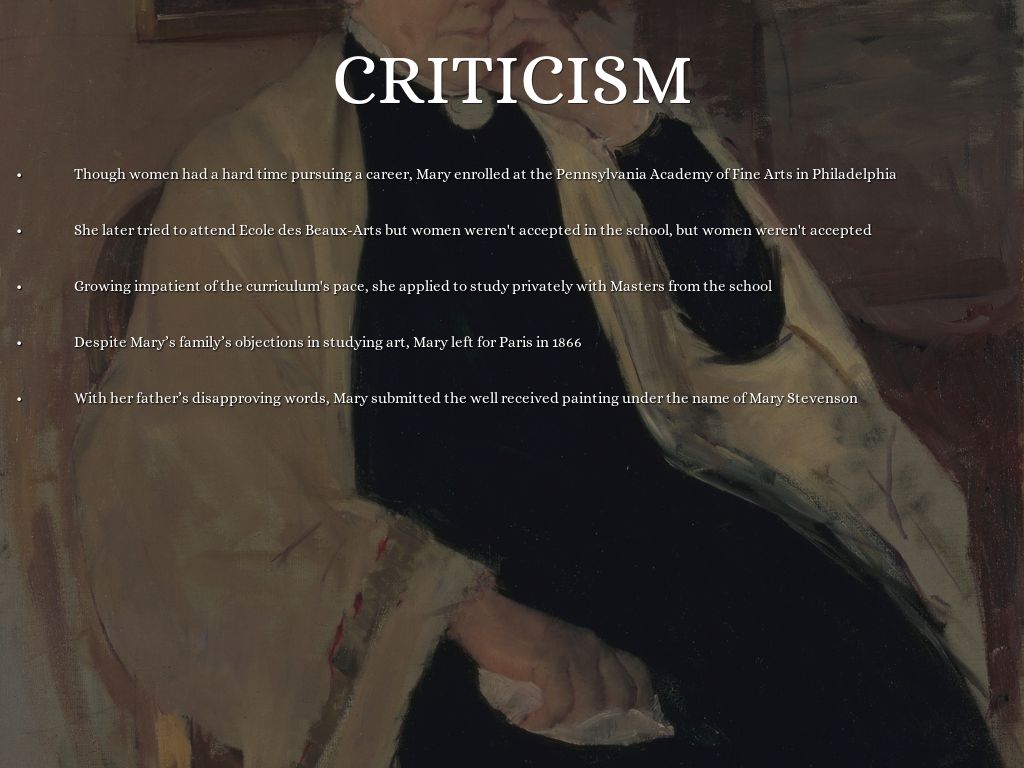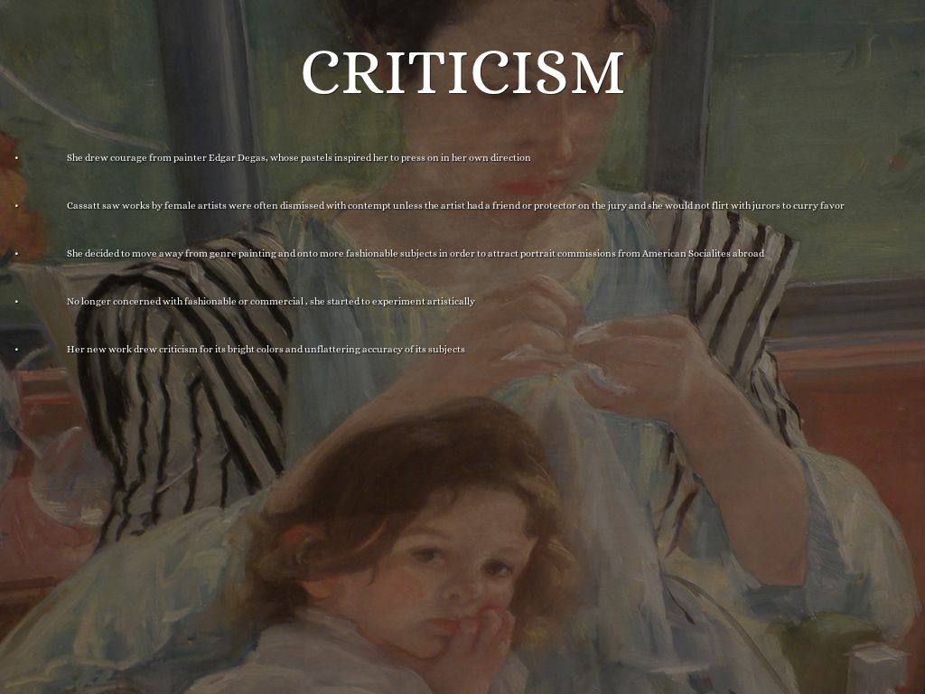 Cassatt saw works by female artists were often dismissed with contempt unless the artist had a friend or protector on the jury and she would not flirt with jurors to curry favor