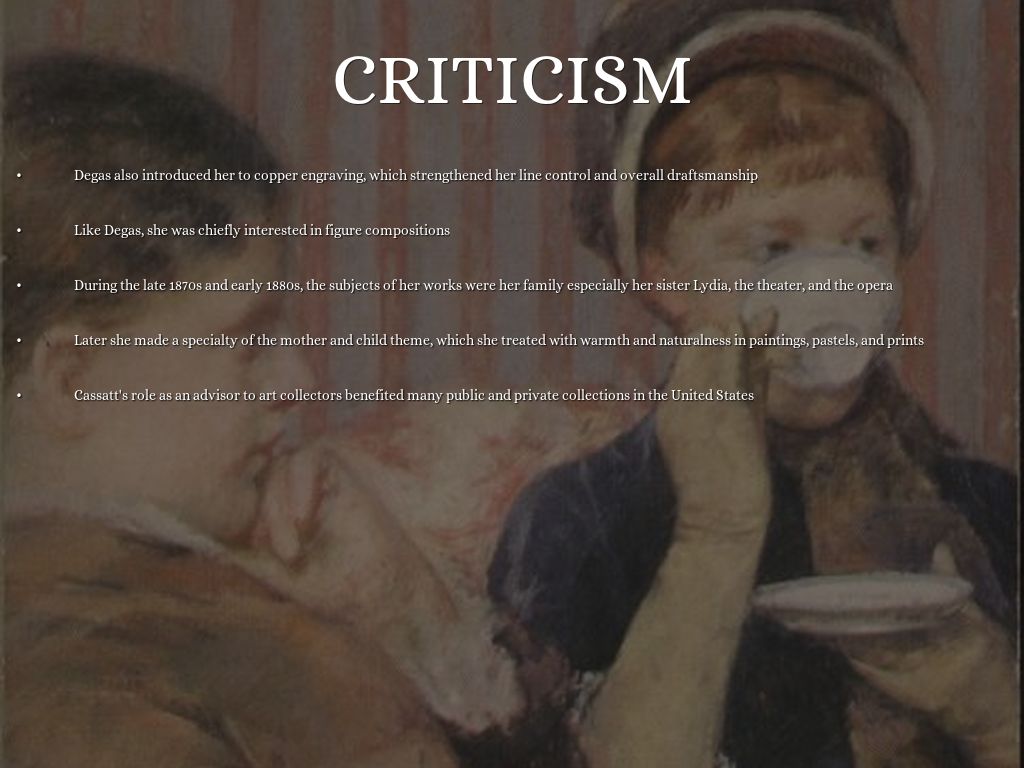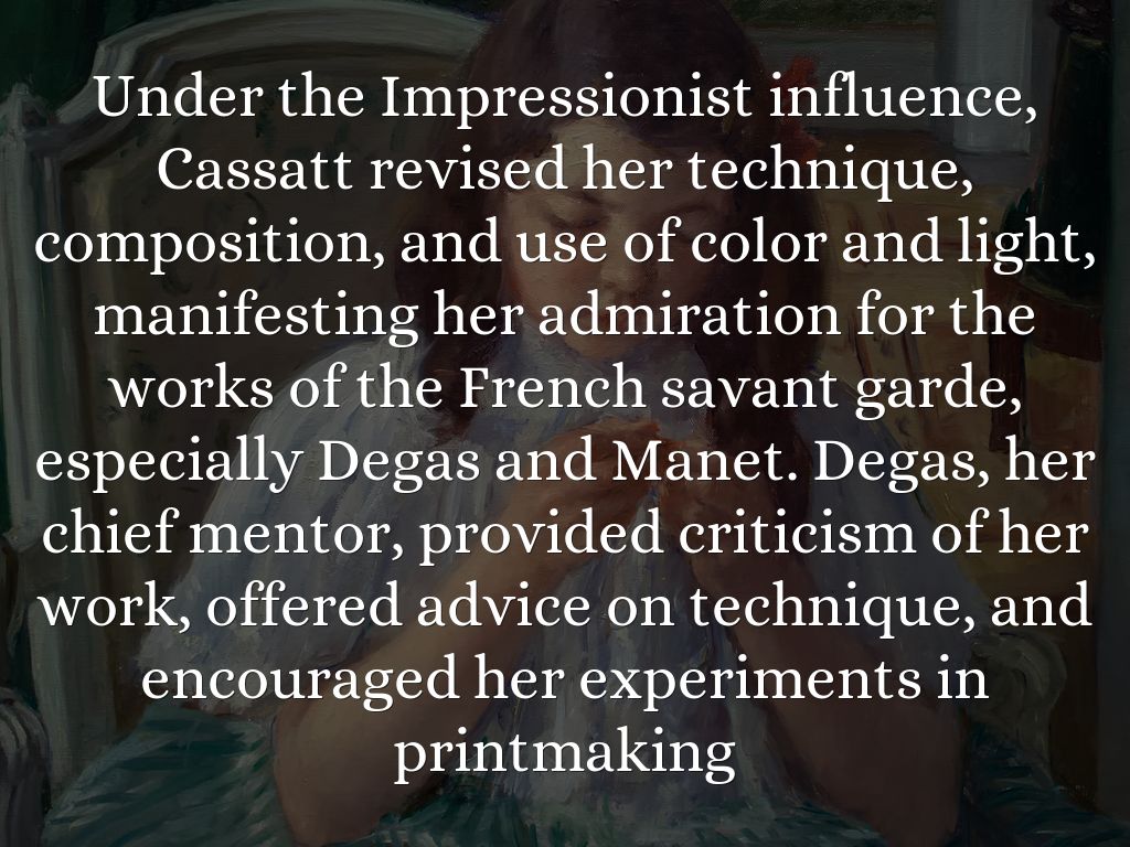 Under the Impressionist influence, Cassatt revised her technique, composition, and use of color and light, manifesting her admiration for the works of the French savant garde, especially Degas and Manet. Degas, her chief mentor, provided criticism of her work, offered advice on technique, and encouraged her experiments in printmaking