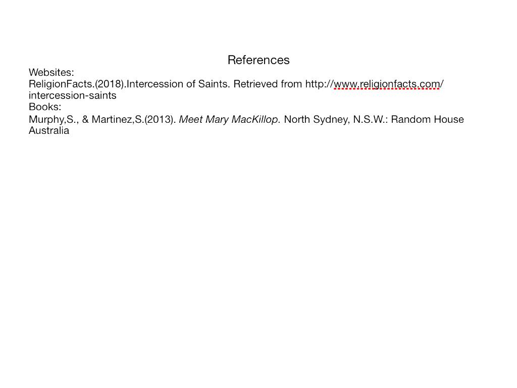 Intercession Prayer (Made By Me) Gracious and almighty god, We remember all those that are forgotten, poor & homeless, those that have been neglected. All that have no one to care for their soul. Those overlooked and misjudged. Through the intercession of Mary MacKillop,We ask you to help us become your voice- speaking through love and acceptance. Become your ears to hear their cries, Become your feet to walk besides those that are needy for love and care. Lord help us become your hands- help those in need in all ways; shelter,clothe. Grant this Lord, for the love of your children Amen