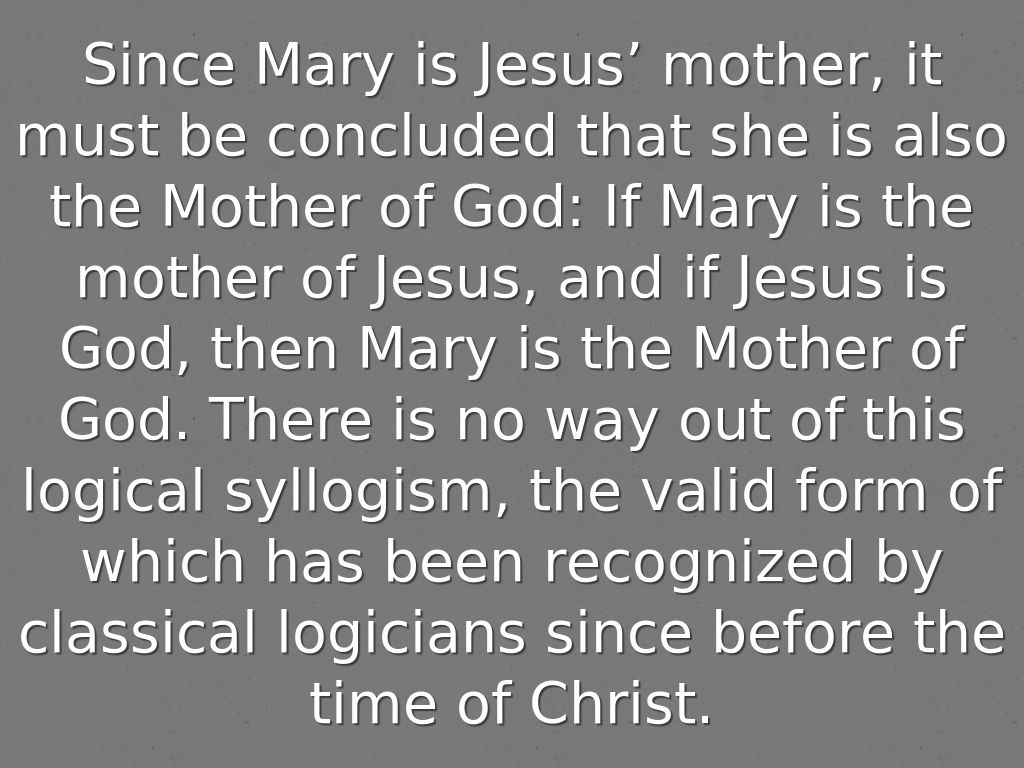 Since Mary is Jesus’ mother, it must be concluded that she is also the Mother of God: If Mary is the mother of Jesus, and if Jesus is God, then Mary is the Mother of God. There is no way out of this logical syllogism, the valid form of which has been recognized by classical logicians since before the time of Christ.