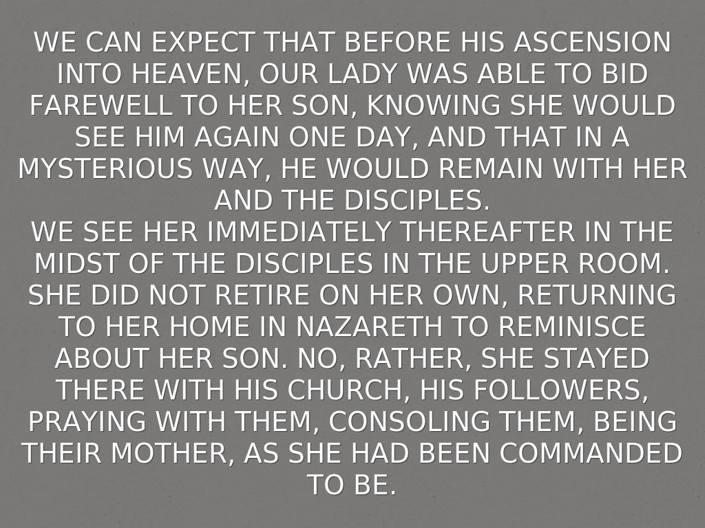 WE CAN EXPECT THAT BEFORE HIS ASCENSION INTO HEAVEN, OUR LADY WAS ABLE TO BID FAREWELL TO HER SON, KNOWING SHE WOULD SEE HIM AGAIN ONE DAY, AND THAT IN A MYSTERIOUS WAY, HE WOULD REMAIN WITH HER AND THE DISCIPLES.