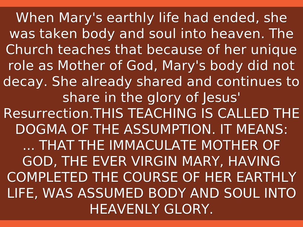 When Mary's earthly life had ended, she was taken body and soul into heaven. The Church teaches that because of her unique role as Mother of God, Mary's body did not decay. She already shared and continues to share in the glory of Jesus' Resurrection.THIS TEACHING IS CALLED THE DOGMA OF THE ASSUMPTION. IT MEANS: