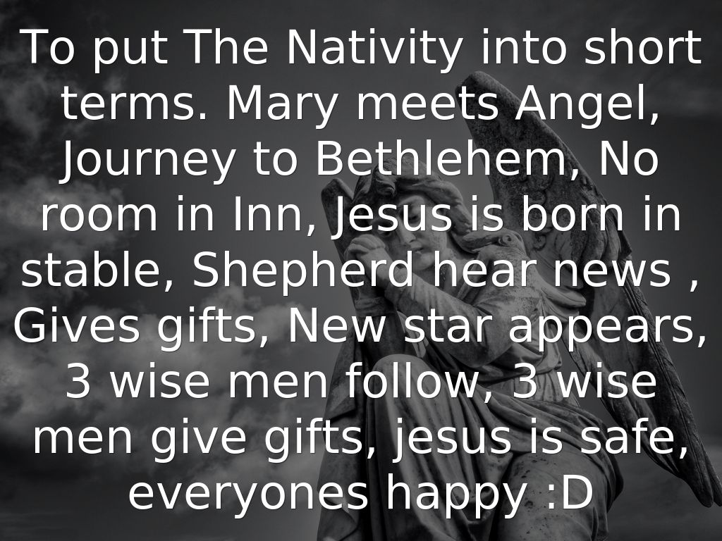 To put The Nativity into short terms. Mary meets Angel, Journey to Bethlehem, No room in Inn, Jesus is born in stable, Shepherd hear news , Gives gifts, New star appears, 3 wise men follow, 3 wise men give gifts, jesus is safe, everyones happy :D