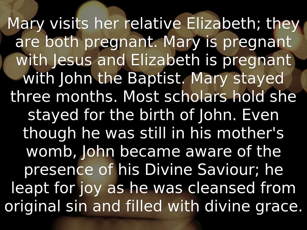 Mary visits her relative Elizabeth; they are both pregnant. Mary is pregnant with Jesus and Elizabeth is pregnant with John the Baptist. Mary stayed three months. Most scholars hold she stayed for the birth of John. Even though he was still in his mother's womb, John became aware of the presence of his Divine Saviour; he leapt for joy as he was cleansed from original sin and filled with divine grace.