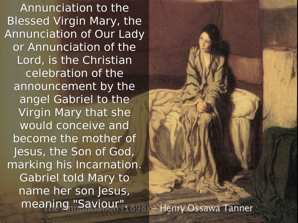 Annunciation to the Blessed Virgin Mary, the Annunciation of Our Lady or Annunciation of the Lord, is the Christian celebration of the announcement by the angel Gabriel to the Virgin Mary that she would conceive and become the mother of Jesus, the Son of God, marking his Incarnation. Gabriel told Mary to name her son Jesus, meaning "Saviour".
