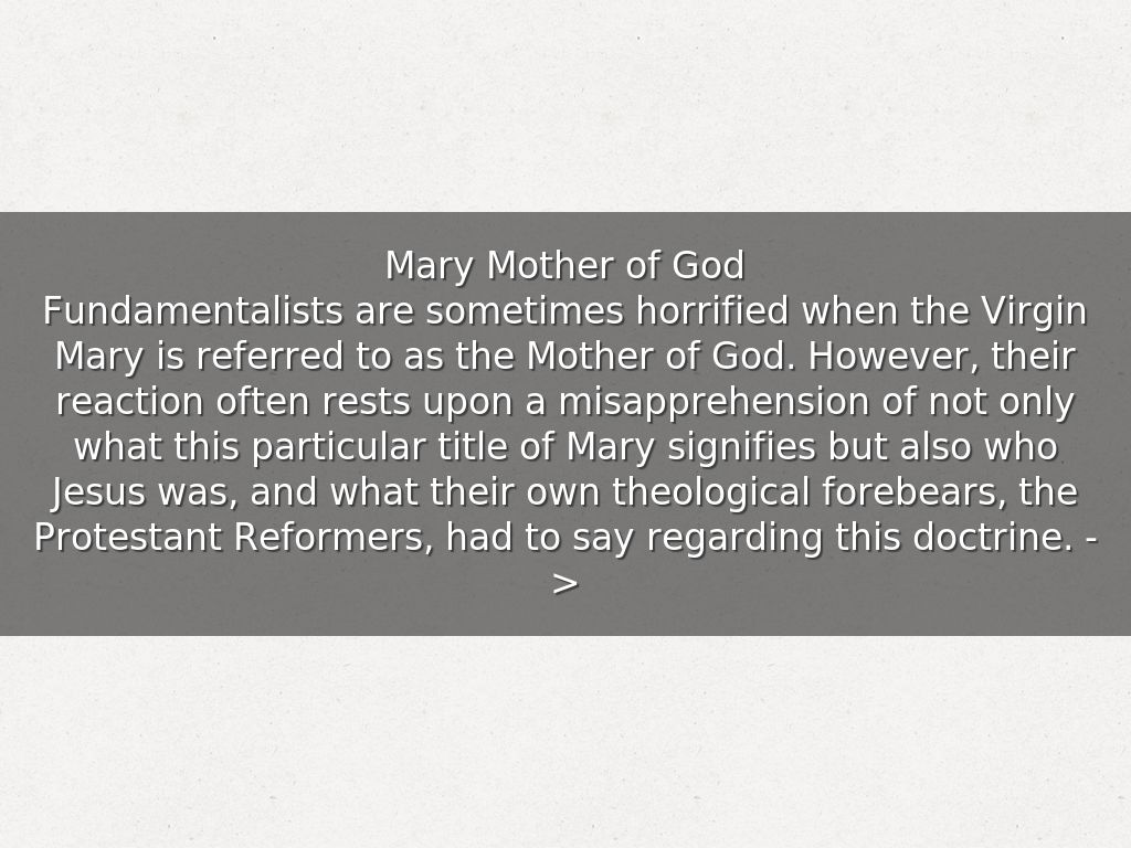 Fundamentalists are sometimes horrified when the Virgin Mary is referred to as the Mother of God. However, their reaction often rests upon a misapprehension of not only what this particular title of Mary signifies but also who Jesus was, and what their own theological forebears, the Protestant Reformers, had to say regarding this doctrine. ->