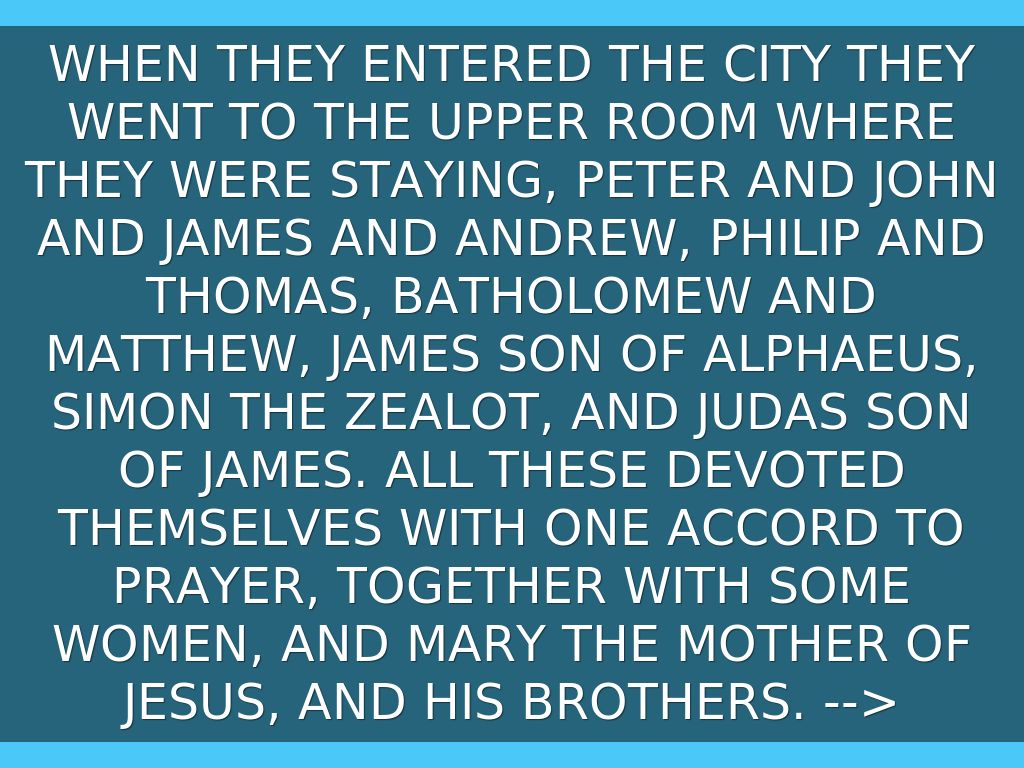WHEN THEY ENTERED THE CITY THEY WENT TO THE UPPER ROOM WHERE THEY WERE STAYING, PETER AND JOHN AND JAMES AND ANDREW, PHILIP AND THOMAS, BATHOLOMEW AND MATTHEW, JAMES SON OF ALPHAEUS, SIMON THE ZEALOT, AND JUDAS SON OF JAMES. ALL THESE DEVOTED THEMSELVES WITH ONE ACCORD TO PRAYER, TOGETHER WITH SOME WOMEN, AND MARY THE MOTHER OF JESUS, AND HIS BROTHERS. -->
