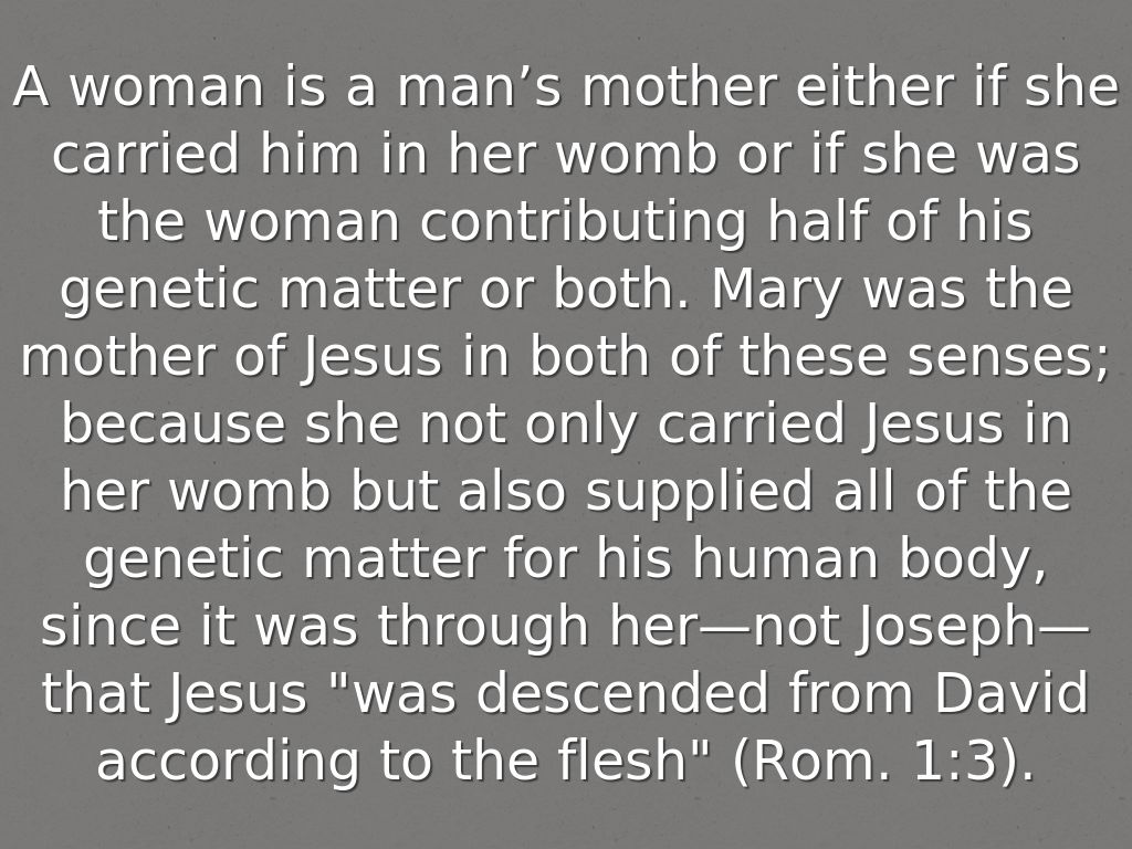 A woman is a man’s mother either if she carried him in her womb or if she was the woman contributing half of his genetic matter or both. Mary was the mother of Jesus in both of these senses; because she not only carried Jesus in her womb but also supplied all of the genetic matter for his human body, since it was through her—not Joseph—that Jesus "was descended from David according to the flesh" (Rom. 1:3).