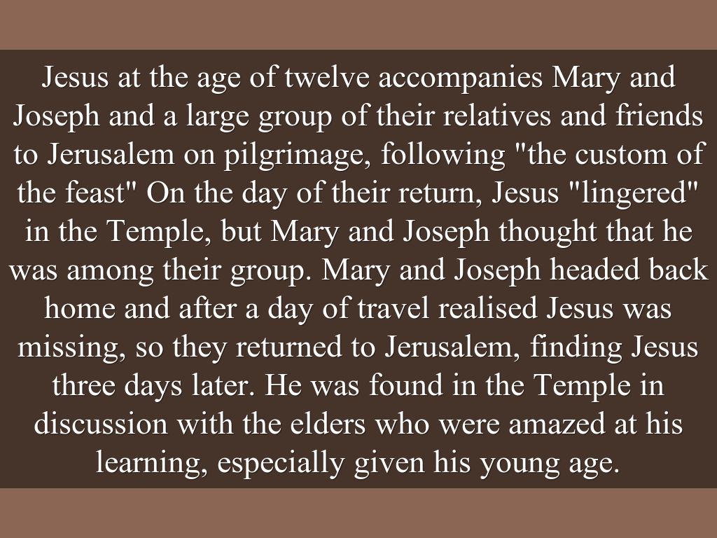 Jesus at the age of twelve accompanies Mary and Joseph and a large group of their relatives and friends to Jerusalem on pilgrimage, following "the custom of the feast" On the day of their return, Jesus "lingered" in the Temple, but Mary and Joseph thought that he was among their group. Mary and Joseph headed back home and after a day of travel realised Jesus was missing, so they returned to Jerusalem, finding Jesus three days later. He was found in the Temple in discussion with the elders who were amazed at his learning, especially given his young age.