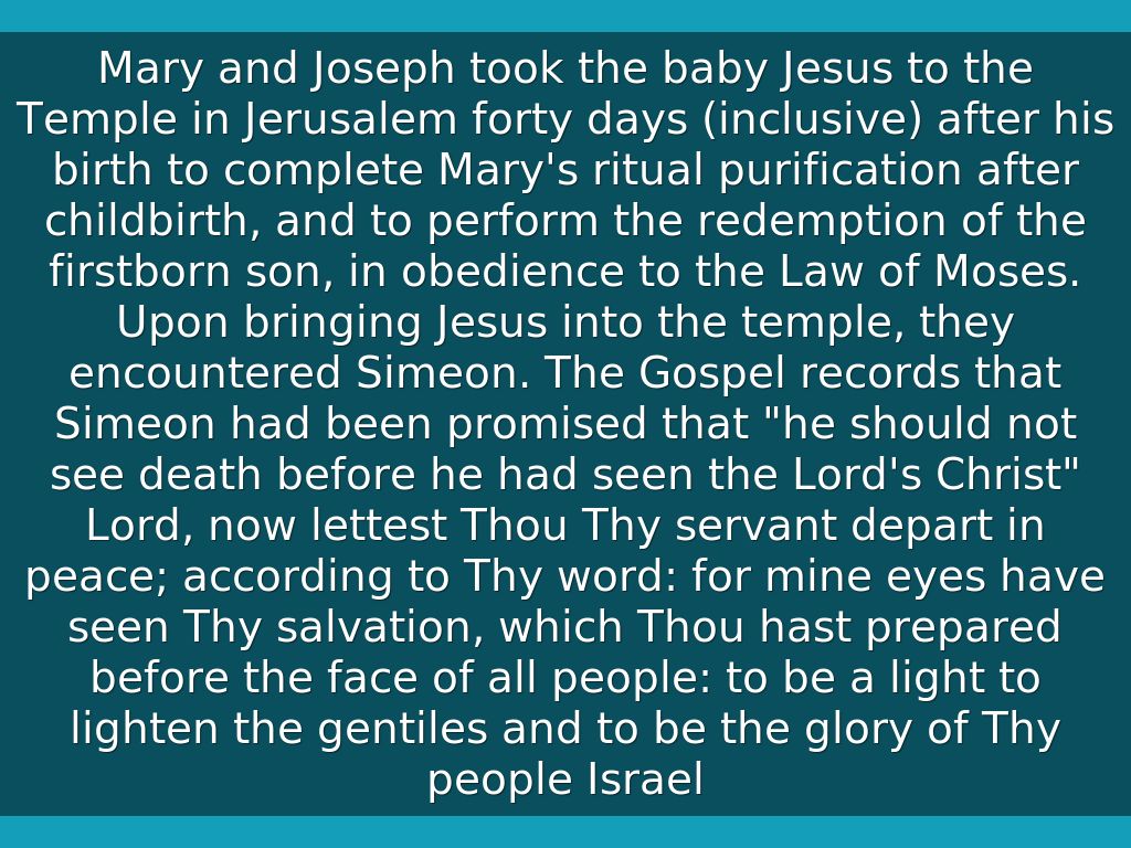 Mary and Joseph took the baby Jesus to the Temple in Jerusalem forty days (inclusive) after his birth to complete Mary's ritual purification after childbirth, and to perform the redemption of the firstborn son, in obedience to the Law of Moses. Upon bringing Jesus into the temple, they encountered Simeon. The Gospel records that Simeon had been promised that "he should not see death before he had seen the Lord's Christ" Lord, now lettest Thou Thy servant depart in peace; according to Thy word: for mine eyes have seen Thy salvation, which Thou hast prepared before the face of all people: to be a light to lighten the gentiles and to be the glory of Thy people Israel