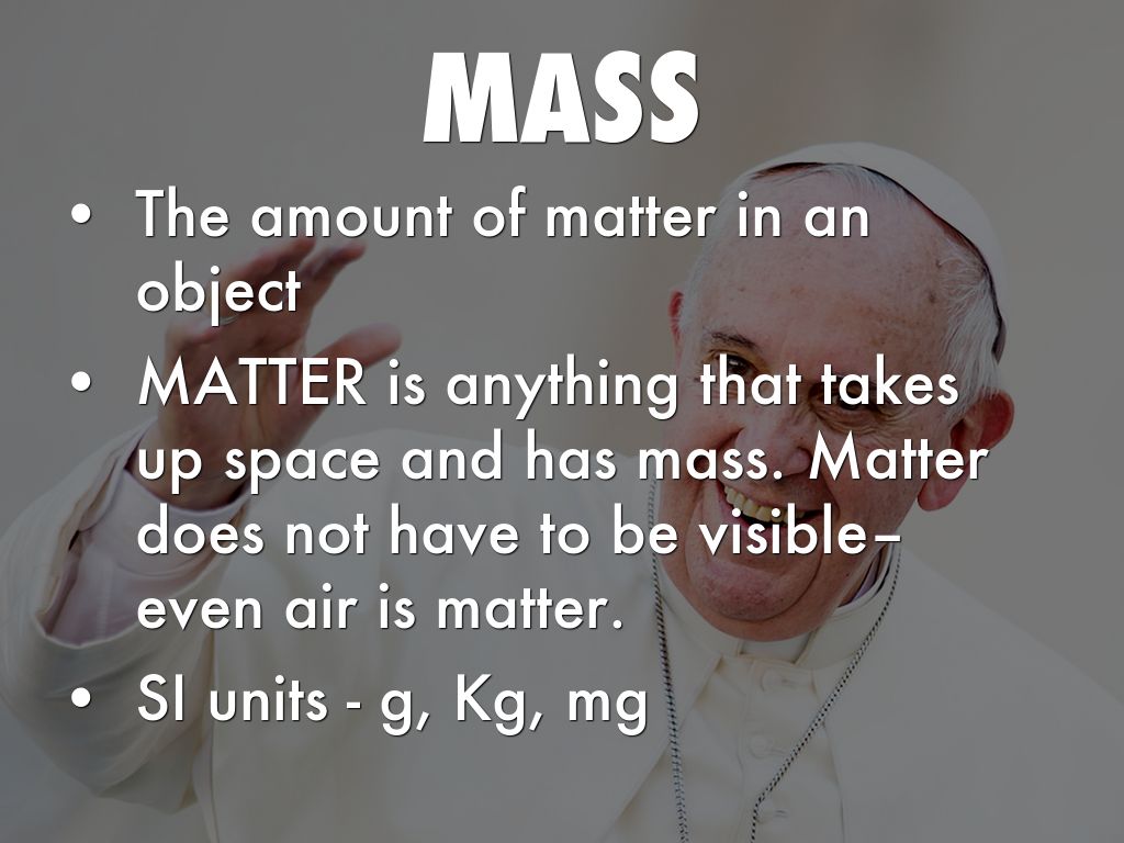 MATTER is anything that takes up space and has mass. Matter does not have to be visible– even air is matter.