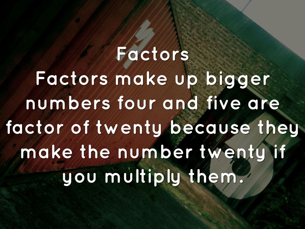Factors make up bigger numbers four and five are factor of twenty because they make the number twenty if you multiply them.