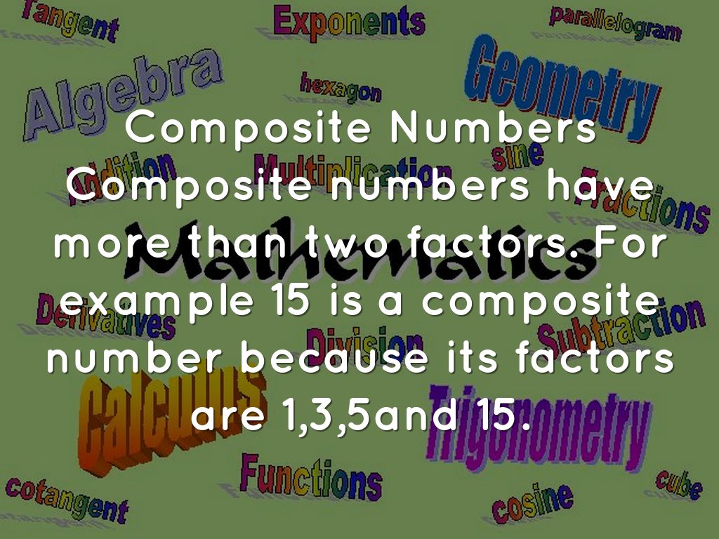 Composite numbers have more than two factors. For example 15 is a composite number because its factors are 1,3,5and 15.