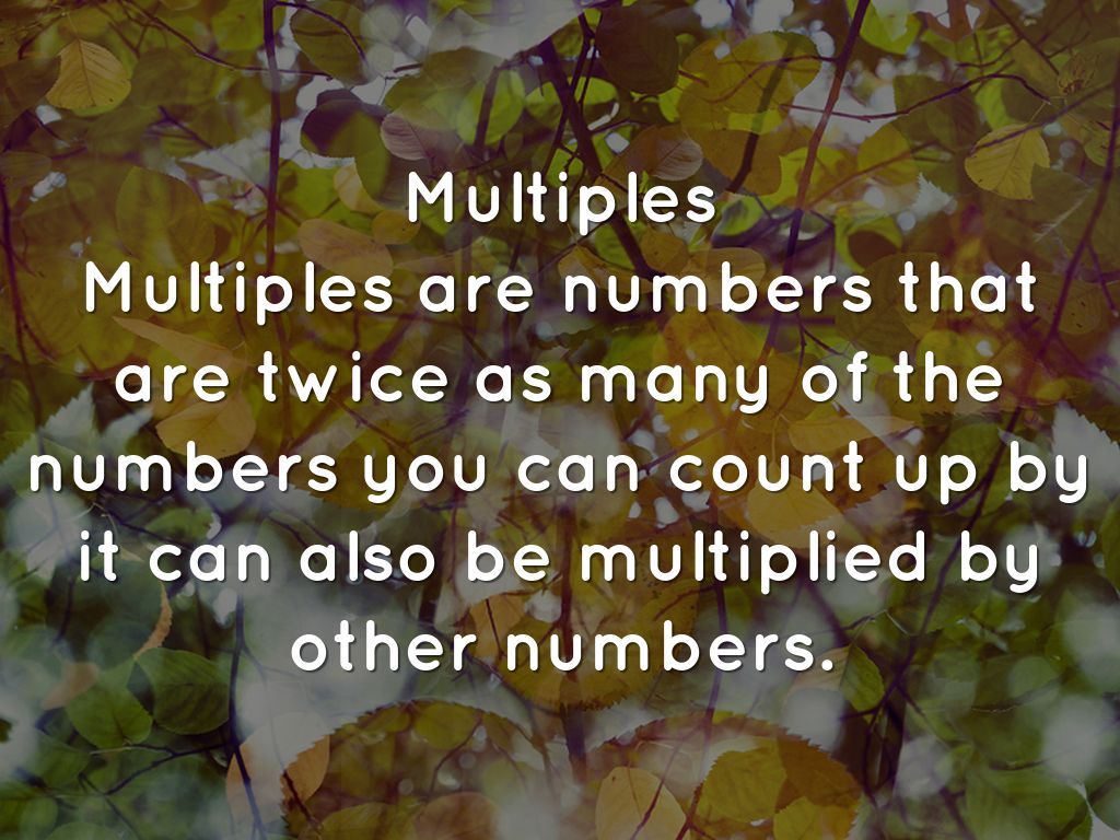 Multiples are numbers that are twice as many of the numbers you can count up by it can also be multiplied by other numbers.