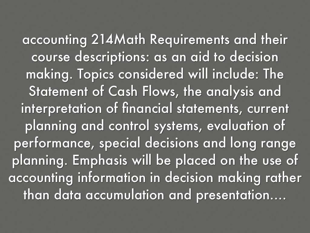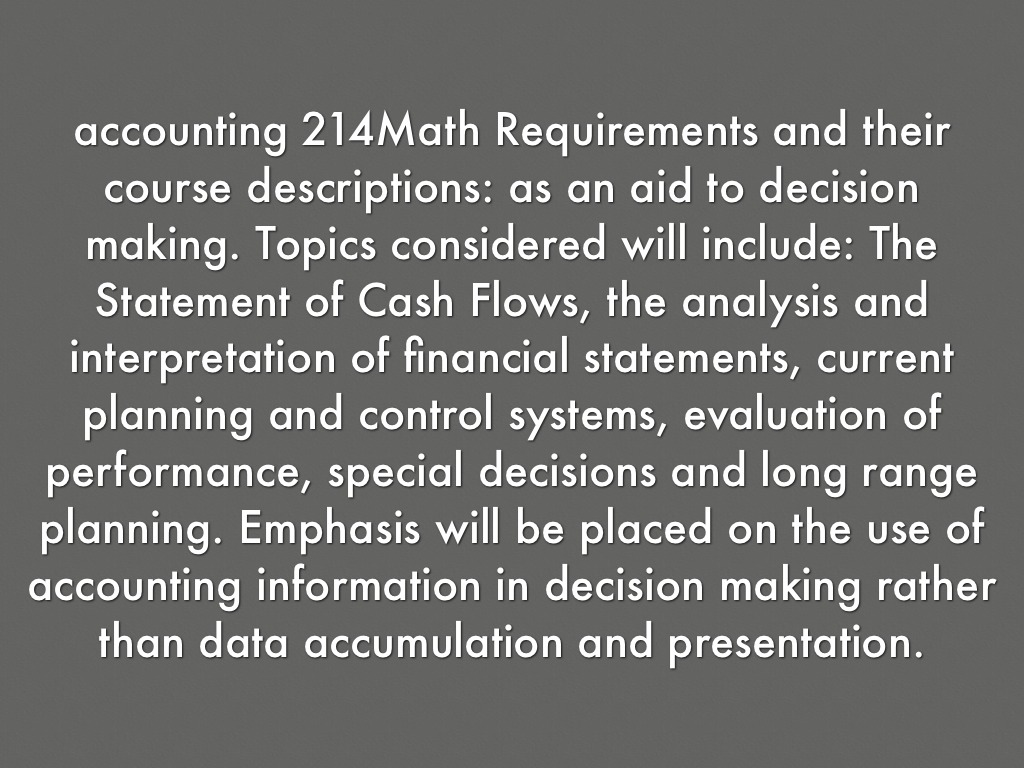 accounting 214Math Requirements and their course descriptions: as an aid to decision making. Topics considered will include: The Statement of Cash Flows, the analysis and interpretation of financial statements, current planning and control systems, evaluation of performance, special decisions and long range planning. Emphasis will be placed on the use of accounting information in decision making rather than data accumulation and presentation.