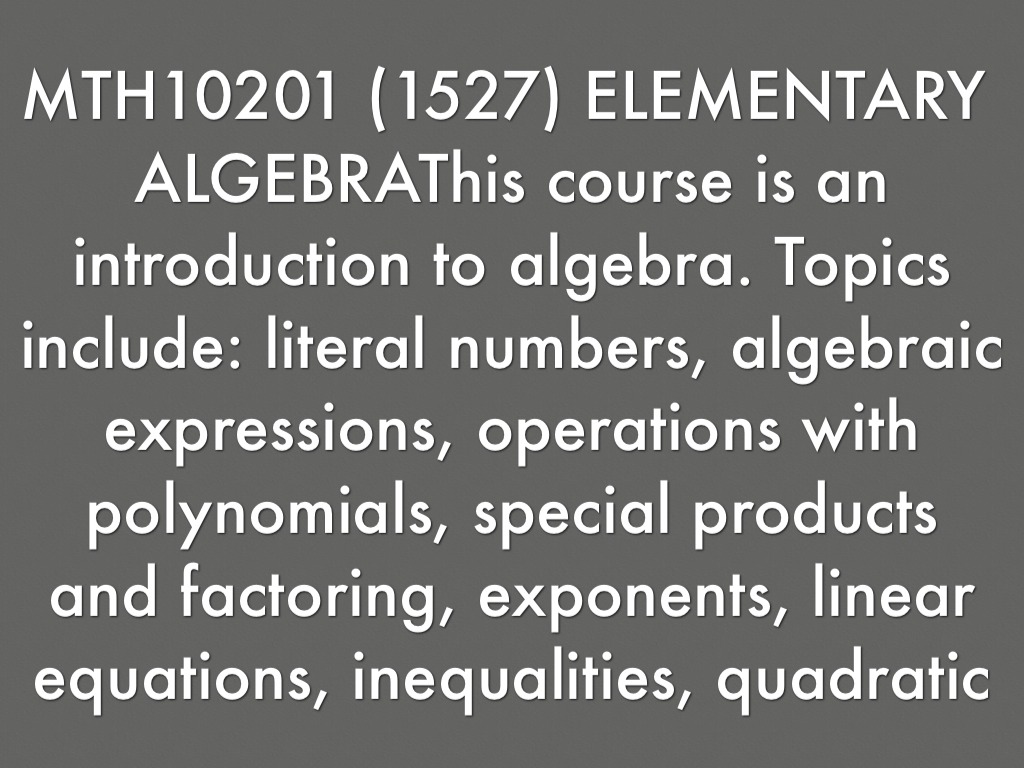 MTH10201 (1527) ELEMENTARY ALGEBRAThis course is an introduction to algebra. Topics include: literal numbers, algebraic expressions, operations with polynomials, special products and factoring, exponents, linear equations, inequalities, quadratic