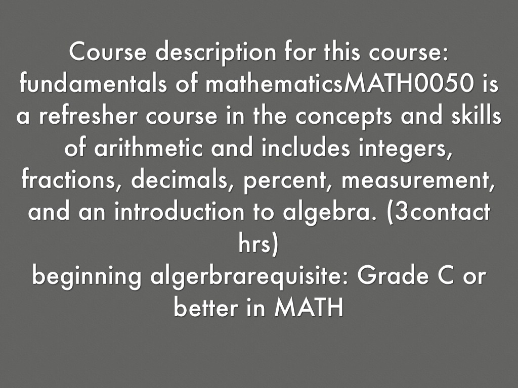 fundamentals of mathematicsMATH0050 is a refresher course in the concepts and skills of arithmetic and includes integers, fractions, decimals, percent, measurement, and an introduction to algebra. (3contact hrs)