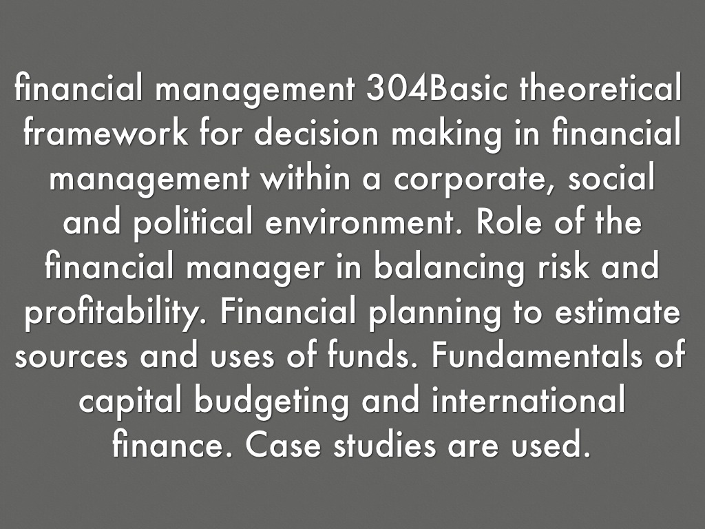 financial management 304Basic theoretical framework for decision making in financial management within a corporate, social and political environment. Role of the financial manager in balancing risk and profitability. Financial planning to estimate sources and uses of funds. Fundamentals of capital budgeting and international finance. Case studies are used.