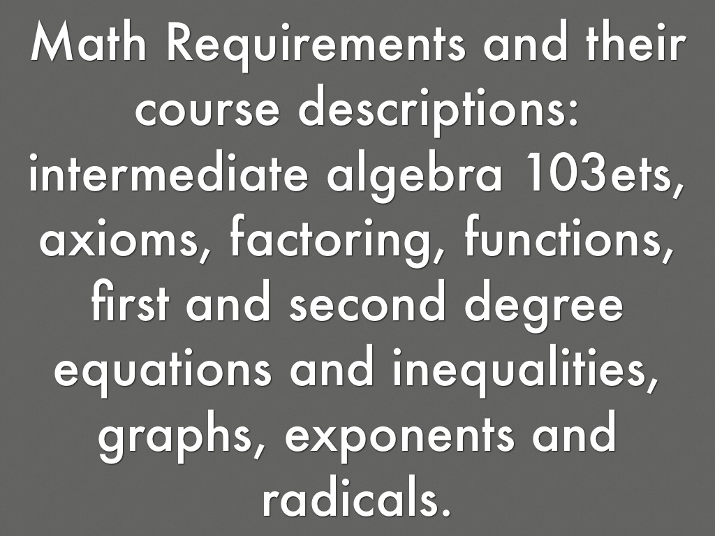 intermediate algebra 103ets, axioms, factoring, functions, first and second degree equations and inequalities, graphs, exponents and radicals.
