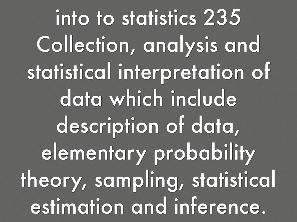into to statistics 235Collection, analysis and statistical interpretation of data which include description of data, elementary probability theory, sampling, statistical estimation and inference.