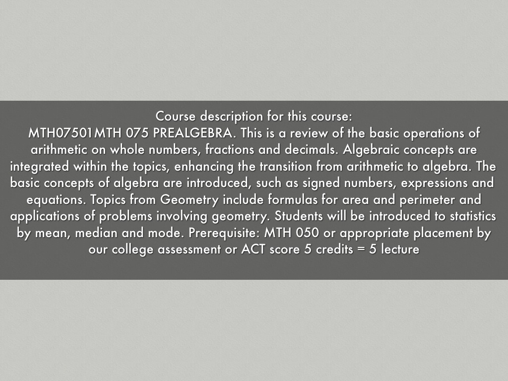 MTH07501MTH 075 PREALGEBRA. This is a review of the basic operations of arithmetic on whole numbers, fractions and decimals. Algebraic concepts are integrated within the topics, enhancing the transition from arithmetic to algebra. The basic concepts of algebra are introduced, such as signed numbers, expressions and equations. Topics from Geometry include formulas for area and perimeter and applications of problems involving geometry. Students will be introduced to statistics by mean, median and mode. Prerequisite: MTH 050 or appropriate placement by our college assessment or ACT score 5 credits = 5 lecture