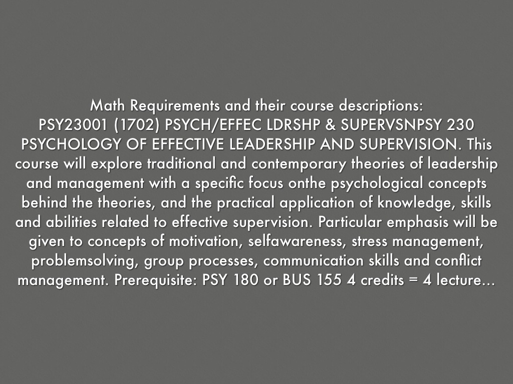 PSY23001 (1702) PSYCH/EFFEC LDRSHP & SUPERVSNPSY 230 PSYCHOLOGY OF EFFECTIVE LEADERSHIP AND SUPERVISION. This course will explore traditional and contemporary theories of leadership and management with a specific focus onthe psychological concepts behind the theories, and the practical application of knowledge, skills and abilities related to effective supervision. Particular emphasis will be given to concepts of motivation, selfawareness, stress management, problemsolving, group processes, communication skills and conflict management. Prerequisite: PSY 180 or BUS 155 4 credits = 4 lecture