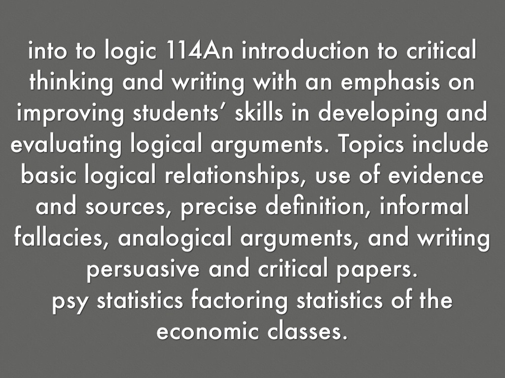 into to logic 114An introduction to critical thinking and writing with an emphasis on improving students’ skills in developing and evaluating logical arguments. Topics include basic logical relationships, use of evidence and sources, precise definition, informal fallacies, analogical arguments, and writing persuasive and critical papers.