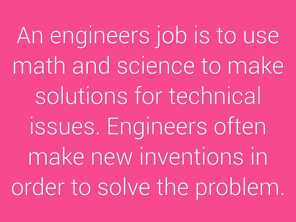 An engineers job is to use math and science to make solutions for technical issues. Engineers often make new inventions in order to solve the problem.