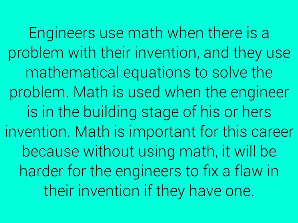 Engineers use math when there is a problem with their invention, and they use mathematical equations to solve the problem. Math is used when the engineer is in the building stage of his or hers invention. Math is important for this career because without using math, it will be harder for the engineers to fix a flaw in their invention if they have one.
